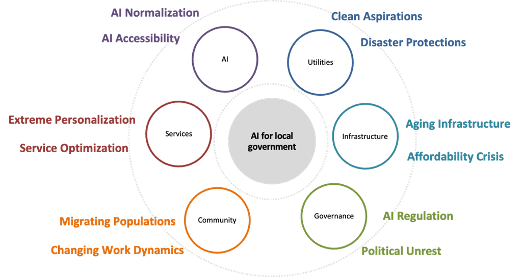 Recommendations include adopting a “core-satellite” strategic approach—starting with manageable, high-impact AI applications (e.g., traffic management, real-time data dashboards, community engagement tools) while building toward broader transformation. The report emphasizes scenario-based preparedness, ensuring municipalities can adapt to a range of possible futures rather than predicting a single outcome.